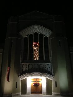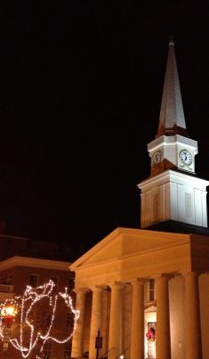 Above, the front door of Jackson Memorial Hall, the building that houses the VMI Museum, is decked out with beautiful white lights and evergreen. Below, the Presbyterian church where Stonewall Jackson served as deacon looks solemn yet spirited. (It got cropped out of the photo, but a star hung in the night sky just over the steeple, too!)