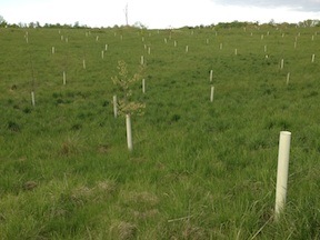 Neon orange flags have been spaced across the property, marking the spots where we need to dig holes. The hardwood saplings, once planted, must also get “tubed”—that is, a three-foot-tall section of mint green Tubex is fitted over the sapling to offer protection and act as an ersatz greenhouse. The corrugated material is bio- and photo-degradable, so it will dissolve within three years, when the saplings are robust enough to survive the elements on their own. Following that, a two-by-two-foot square of black material gets placed around the exterior of the tube to keep down weeds that might compete with the saplings.