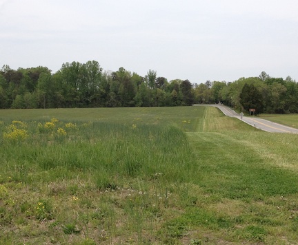 At the top of the ridge, soldiers found an unwelcome surprise: there was more open field ahead, hidden by the ridge. They’d only crossed about two-thirds of the distance they needed to traverse. The ridgeline they had been marching toward was a farm lane that cut across the field; the gateposts in the photo below mark the road trace at the top of the crest. Blockouse Road (seen in the left of the picture) joins the Brock Road here. Confederates used Blockhouse Road to funnel their infantry into position as they double-timed their way to the battlefield.