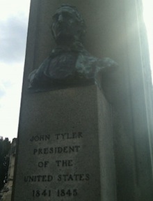 On Presidential Circle today, Monroe and Tyler have plenty of company, although none of it presidential (Jefferson Davis, if one wants to consider him presidential, lies elsewhere the cemetery). Monroe’s caged grave is impossible to miss but Tyler’s obelisk blends in with the others scattered across the knoll. A bust of Tyler adorns the front, though, overlooking the main walkway that brings visitors to the circle—his impassive face impossible to read.