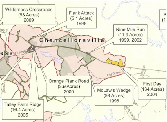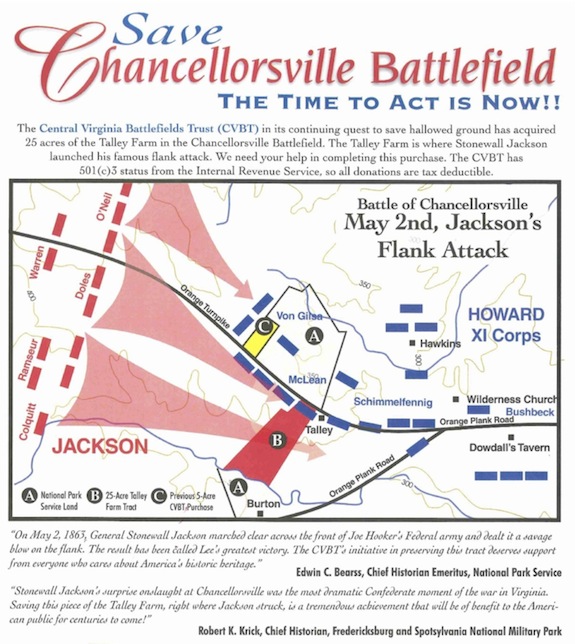 The Central Virginia Battlefields Trust (CVBT) has begun a campaign to preserve a 16.37-acres property on the Chancellorsville battlefield. The ground is where Stonewall Jackson launched his famed flank attack on May 2, 1863. A look at the enclosed map shows how this latest acquisition ties in with our previous purchases, much like a jigsaw coming together….[5]