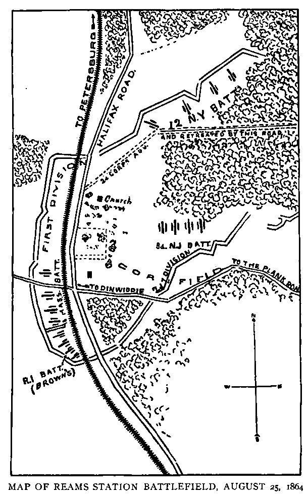 The Second Corps position at Reams Station incorporated earthworks dug by the Sixth Corps in late June while scrambling to the railroad to protect the returning cavalry of the Wilson-Kautz Raid. “They were hurriedly thrown up, badly constructed, and poorly located,” critiqued Lieutenant George K. Dauchy who commanded the 12th Battery, New York Light Artillery.[1] Nevertheless the Second Corps artillerists manhandled their pieces into this position, rather than building a new one from scratch.