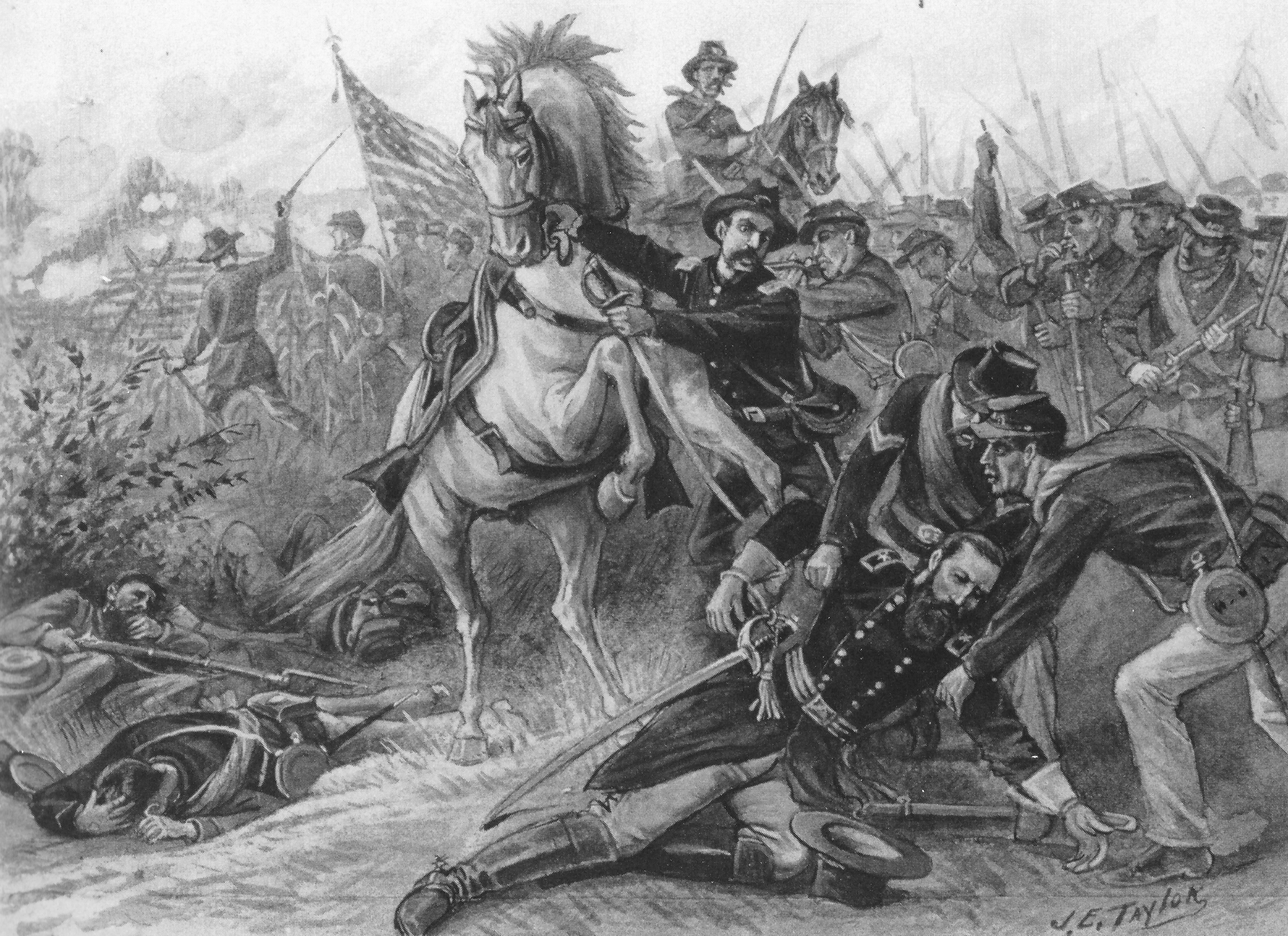 Recognizing that the pivotal moment was at hand, Russell reacted swiftly, ordering his brigades to deploy into line of battle and move forward to plug the hole. Astride his horse and watching his men prepare to meet the Rebels, a shell burst overhead. Shrapnel struck Russell in the head and he fell from his mount dead. His efforts would not be in vain. One soldier lamented that they had lost “another of our…gallant officers”. Despite their loss, Russell’s men counterattacked and drove the Rebels back to their original position.