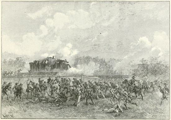Private William B. Smith of the 14th Illinois Infantry described what was his first and last battle, which pitted his garrison of 84 men against General Daniel Reynolds’s Arkansas Brigade on the afternoon of October 4th: “Firing then ceased for a short time, during which we could hear the Confederate officers as they were forming a storming party and gave the orders preparatory to the charge. Hearing this we stood to our guns, hammers raised, and fingers to triggers. It was a moment of unspeakable suspense as we thus stood and peered through the loopholes over the long steel barrels of our trusty rifles breathlessly awaiting the desperate charge and the proper moment to press the death dealing trigger. We had but a moment to wait when the enemy, maddened at their loss and our stubborn resistance, surged over the roadbed and made a wild rush up the hill with their peculiar yell. In this fifty yards of open slope we moved them down like grain before the sickle, but with our most rapid deadly fire we could not check them. On, on they swept up the hillside in the face of our leaden hail, a mad, resistless tide of gray, whose right and left striking the stockade, swept entirely around it, completely engulfing us in a seething mass of yelling Confederates. Four Confederate flags were soon waving over our stockade, and their smoking rifles thrust through our loopholes, and for a few moments our brave old company fought the desperate Johnnies under their stars and bars, at times our muskets locking horns and theirs in the some loopholes in hand to hand contest. “