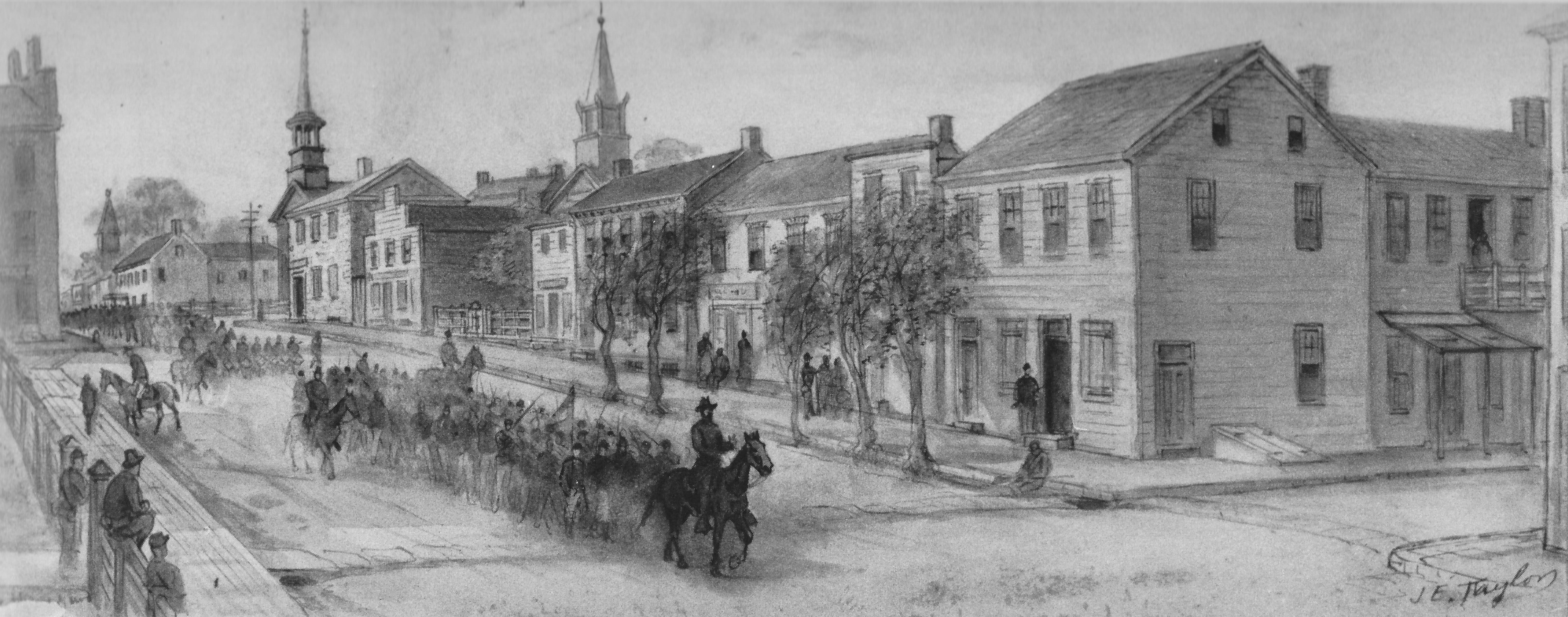 Following the Battle of Fisher’s Hill, the Federals pursued Jubal Early’s retreating Confederates up the Shenandoah Valley. Here, artist James Taylor captures George Crook’s Army of West Virginia entering the town of Harrisonburg.