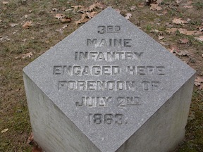 The memory of these soldiers from Maine on the morning of July 2 is remembered by a few monuments on the Gettysburg battlefield set off on a side road accessible from Confederate Avenue. Though oft overlooked and surrounded by many trees, the area gives the illusion that heavy fighting and stories of valor and bravery did not occur there but quite a distance to the south. It is hard to imagine that in the still and peaceful woods surrounding these monuments that the first shots of the bloodiest day at Gettysburg were fired by New Englanders who, through their efforts and loses, far removed from the woods of Maine, added to their reputation as some of the most elite soldiers in the Army of the Potomac.