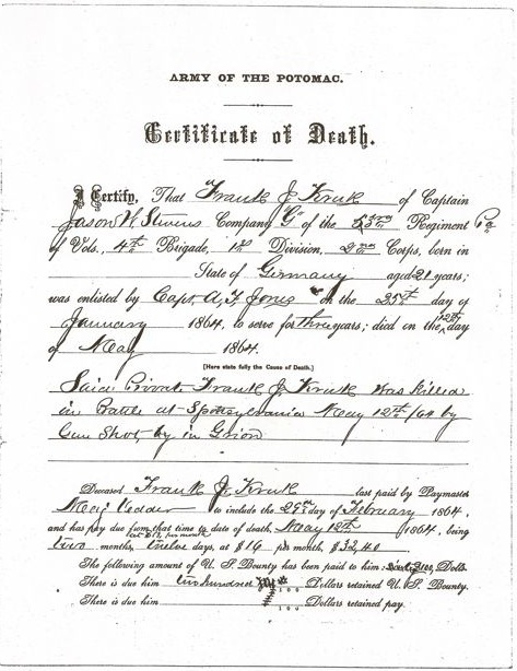 The 53rd embarked on the Wilderness and Spotsylvania campaigns in May, and it was on May 12th during the assault on the Bloody Angle that Pvt. Krug was felled. His death certificate states that he died from “gunshot in groin.” Gut shot, evidently. A mortal wound.