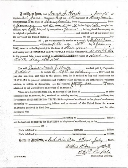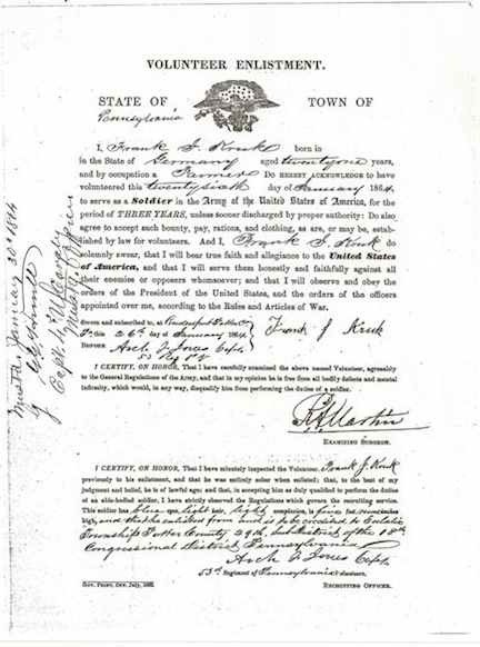 During the winter of 1863-64 when the regiments went home to replenish their ranks, he stepped forward, along with a number of fellow Potter County men, and enlisted in Company G of the 53rd Pennsylvania Infantry Regiment (see his enlistment papers, below). The officer who handled his enlistment was Capt. Arch Jones. (Company G would become known as “Jones’ Rifles.”) Uncle Frank was promised a $300 bonus for enlisting, which certainly would have been a tremendous help for his family, and may have been his primary motivation for joining the Army.