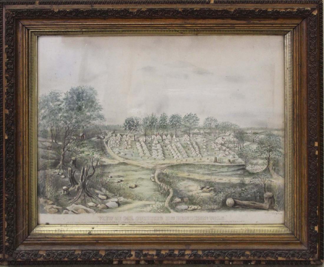 Here was the auction listing for the print; 1863 Civil War Col. Coulter’s 11th PA regiment encampment watercolor signed S B Wilkeson, Charleroi, PA. 19 1/2″ x 25″ Samuel Wilkeson (American 1817-1889) was a newspaper correspondent attached to The Army of the Potomac. Wilkeson covered the Civil War for the New York Times and was present during the Battle of Gettysburg. His 19 year old son Bayard Wilkeson was a first lieutenant commanding Battery G, 4th United States Artillery and was killed at Barlow’s Knoll during the Gettysburg Battle. Samuel Wilkeson pulled his sons body off the battlefield after his son was shot and unsuccessfully amputated his own leg on the battlefield. Samuel Wilkeson wrote a famous report in the battle’s aftermath which appeared in the Times on July 6, 1863. The report was then redistributed as a popular pamphlet under the title “Samuel Wilkeson’s Thrilling Word Picture of Gettysburg”. Wilkeson’s report inspired Abraham Lincoln and Lincoln paraphrased Wilkeson’s words in his “Gettysburg Address”.The 11th PA is pictured encamped at Fletcher’s Chapel, VA., along with the 13th MA, 88th PA, & the 97th NY until April 29th, 1863 before the Chancellorsville campaign. The legend at the bottom includes “the dog Sallie” pictured in the encampment (Sallie Anne Jarrett was a female pit bull terrier with a brindle coat- she accompanied the regiment into every battle. She was wounded in action, nursed back to health, fought at Gettysburg, and was finally killed in action at Hatch’s Run in 1865. A bronze statue was erected at the Gettysburg Battlefield for Sallie Ann after the war)