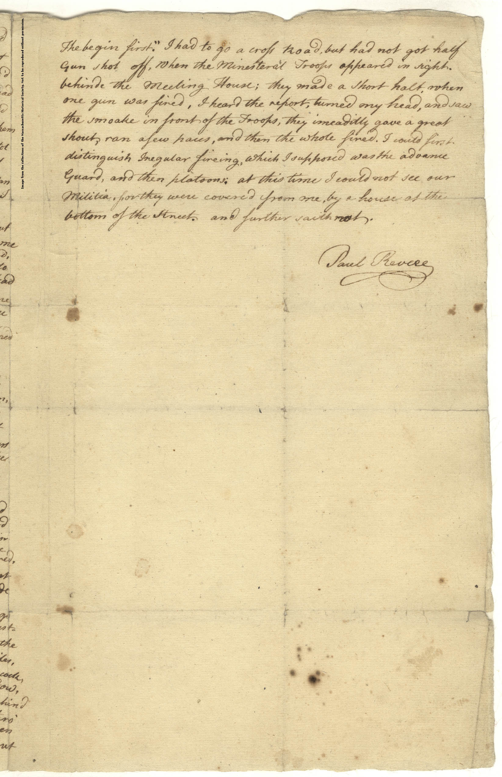 Revere wrote later in his account that as the firing began he was up the road from the green and his view was obstructed by several buildings. Revere’s account does not match the more heroic quote that has been attributed to Parker, but it does coincide with the passive stance that many said Parker was making that day towards the British. There is no mention of letting the British begin a “war” here in Lexington.