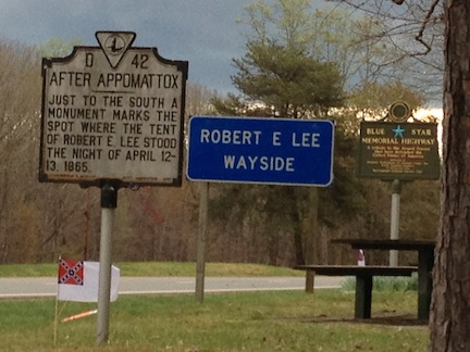 On the night of April 12, as he made his way back to Richmond after leaving the remnants of the Army of Northern Virginia, Robert E. Lee pitched his camp alongside the road. Today, the spot—along modern route 60 midway between Dillwyn and Buckingham—is marked by a few historical signs and a small monument. Small Confederate flags flutter around each monument, sign, and marker like daffodils that have sprung up for the surrender.
