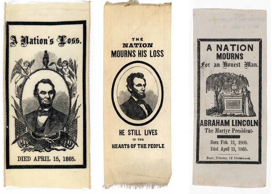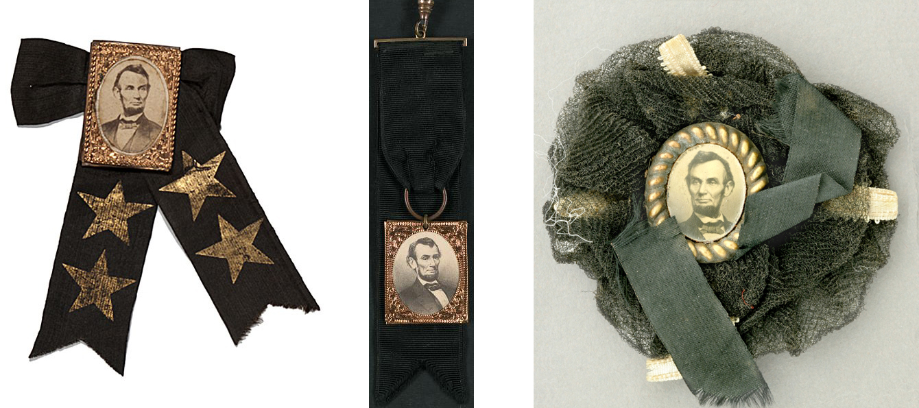 A variety of cockades and badges worn after the death of Abraham Lincoln.