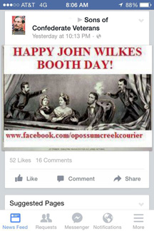 April 14, 2015 marked the 150th anniversary of the assassination of President Abraham Lincoln by John Wilkes Booth. While thousands of Americans marked this occasion with respectful remembrance and mourning, there were many who took the opportunity to cheer the event and extoll the courage and patriotism of Booth. As a PROUD Virginian, a descendant of two Confederate veterans, and member of the Sons of Confederate Veterans, it shames me that such misguided, ignorant thought still exists, especially in the “information age” where the facts are readily available.