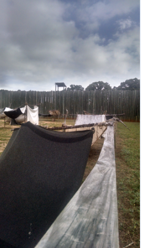 Our first stop is a portion of the reconstructed stockade wall with a watchtower. Based on archeological evidence, the walls have been built in the same location as the originals. Just around the corner are “she bangs”—makeshift shelters fashioned from branches, blankets and ponchos. Here I get a sense of what the living conditions were like for Levi and the Union soldiers confined here.