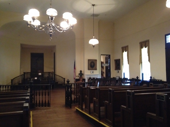 Most surprising was the quiet dignity of the original courtroom, still preserved in its antebellum appearance. A portrait of a youngish Jefferson Davis hangs near the front of the room, and the former judge’s chamber has been converted into a Jefferson Davis memorial room.