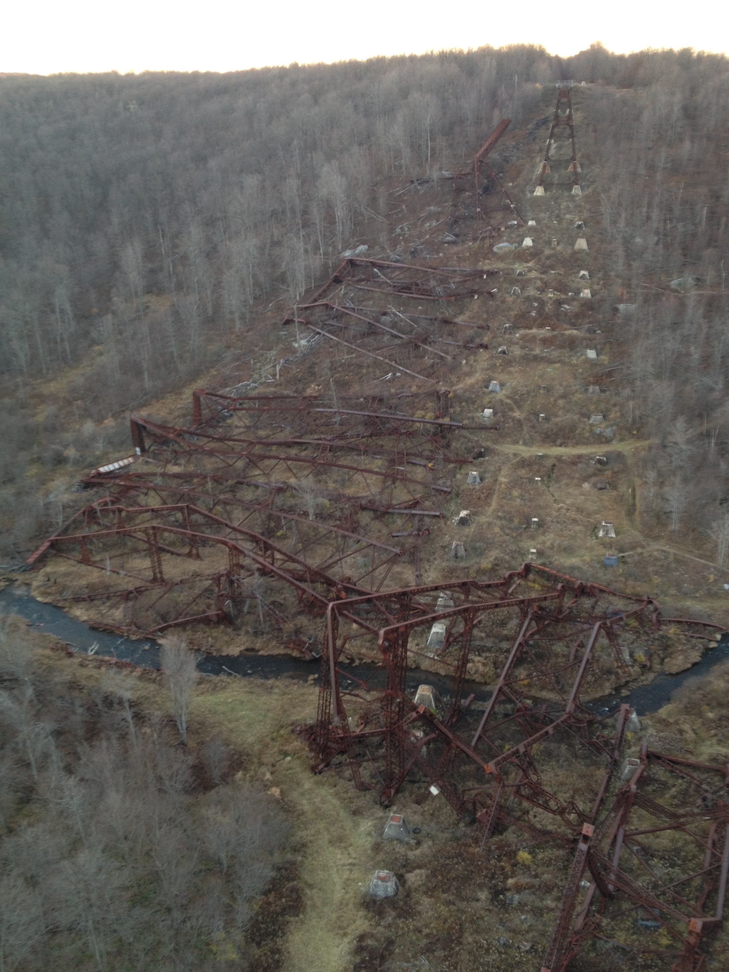 Like the crozzled bones of giants, the steel girders of the Kinzua Viaduct lie along the valley floor and up the far hillside. Once, the railroad bridge stretched across the entire gorge—some 2,050 feet—but in 2003, a tornado blew down eleven of its twenty support towers. They still rest where they fell, twisted, spent, ruined.