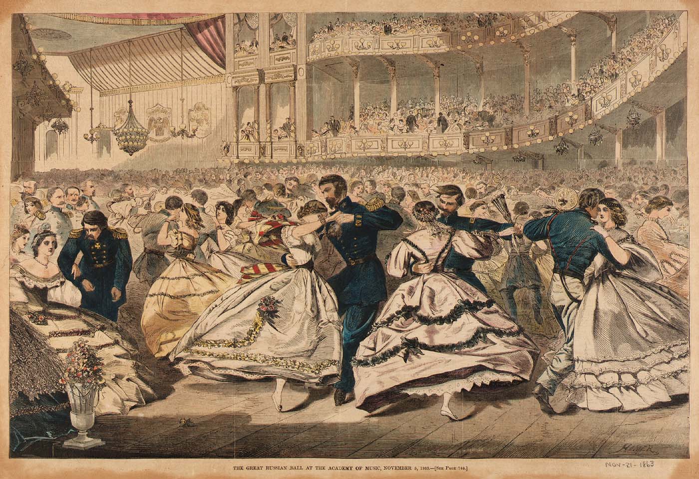 Similar advertisements appear in the Nebraska advertiser in December of 1861 ($1.00 per ticket), the East Saginaw courier in 1862 (50 cents per ticket), and the Washington standard in 1861 ($4.00 per ticket). [vi] The Washington standard advertised a ball in 1864, at Colonel Dowling’s New Hall- supper to be included, but did not declare the admission price.[vii] Another newspaper, the Boise News, recounted the events of a ball the “Messrs. Seeley & Brower” held Christmas Eve of 1863. The paper reported: “we hear it was the most decided success of anything of the sort that has ever taken place in [the] city. Nearly all the gaiety, beauty, fashion, chivalry, gallantry, dignity, and politeness of the place was represented. The only inconvenience spoken of was the crowded state of the hall.”[viii]