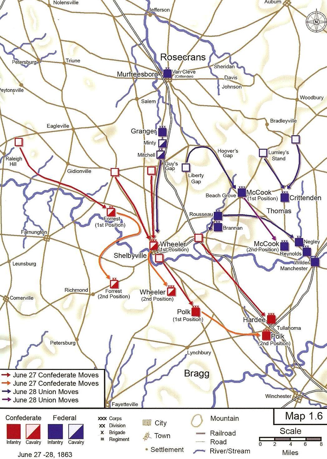 Bragg’s army was stretched across a front of about 30 miles, with cavalry on each flank; his infantry deployed at Shelbyville, Wartrace and the hamlet of Beech Grove. Bragg’s supply depot lay at Tullahoma. Guy’s Gap, Liberty Gap, and Hoover’s Gap lay between Rosecrans and his opponent; narrow defiles which, if stoutly defended, offered Rosecrans only the prospect of bloody frontal assaults.