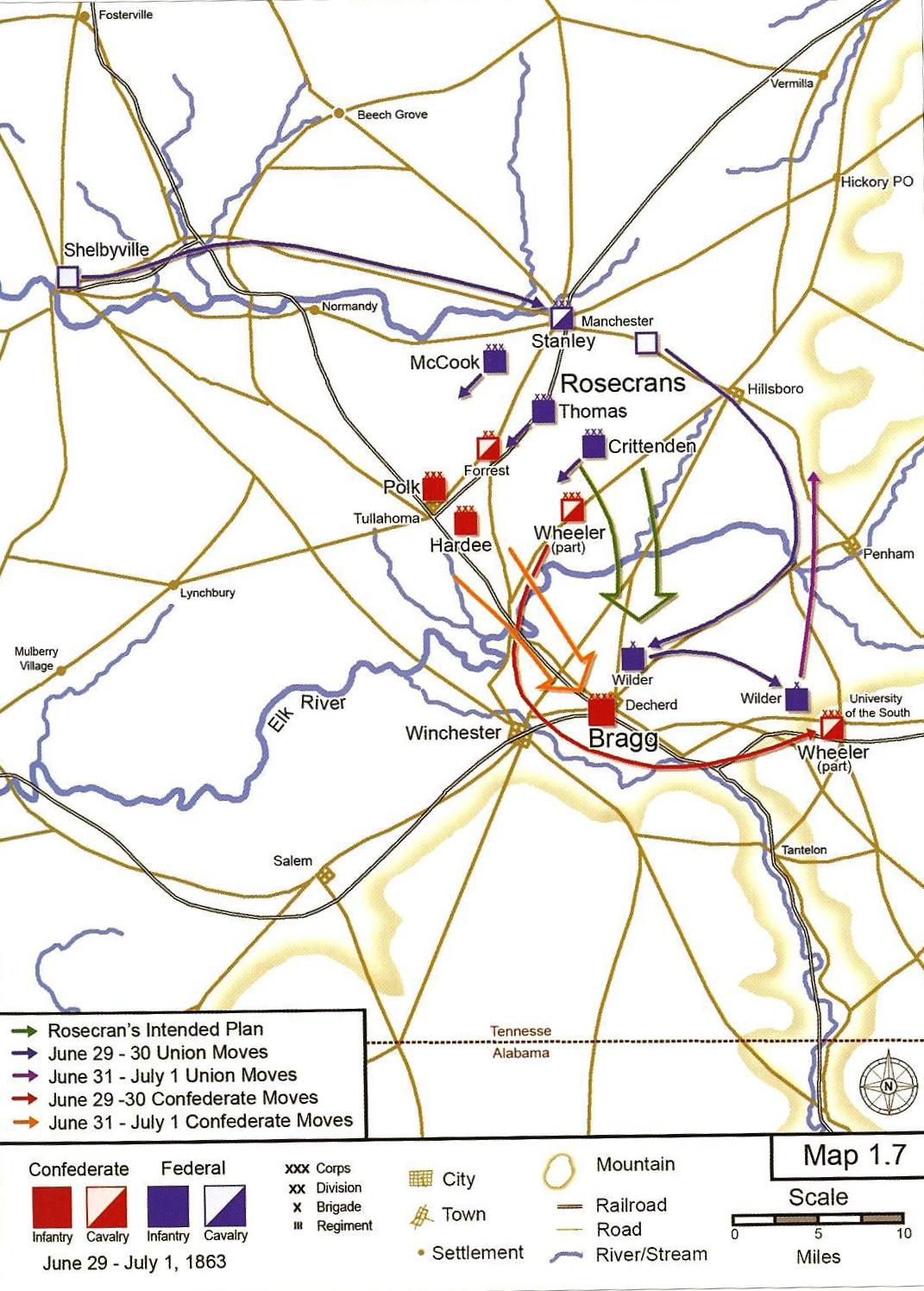 So Rosecrans opted for a different approach. By feinting against the gaps while flanking Bragg to the east, Rosecrans intended to march a corps unopposed first into Manchester and then on to Tullahoma. Capturing that place would not only cripple Bragg’s logistics, but it would also potentially cut Bragg’s best retreat route.