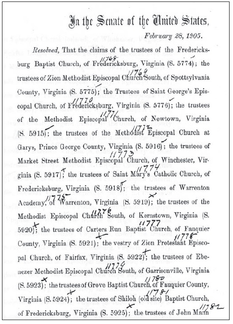 - Court of Claims Congressional Case No. 11,768. Baptist Church of Fredericksburg, Virginia vs. The United States. Entire report including petitions, letters, and examination transcripts. U.S. Treasury Department, (Fredericksburg/Spotsylvania NMPS, Bound Volume 344).
