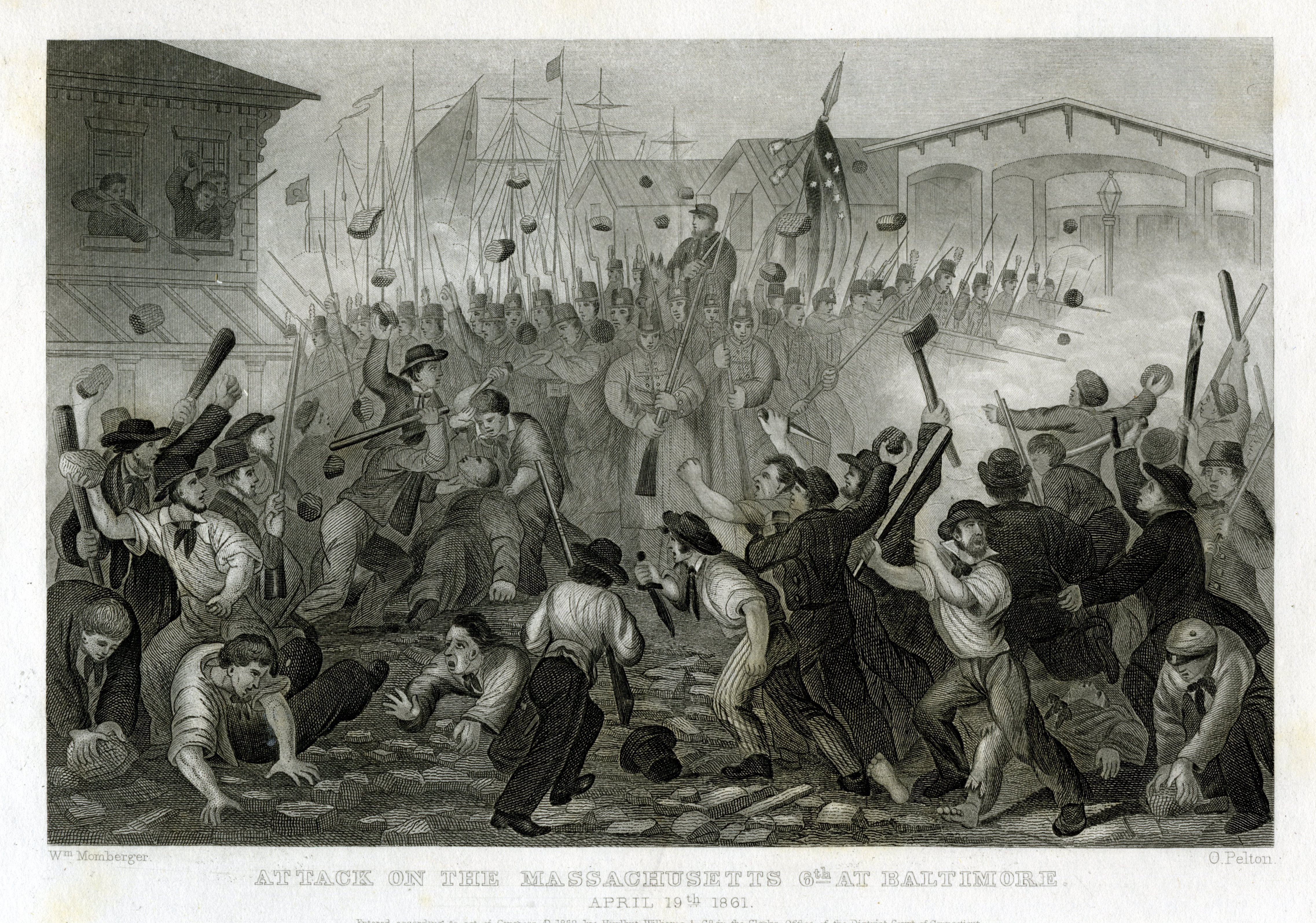 The Pratt Street Riot of April 19, 1861 is well known to students of the American Civil War as some of the earliest bloodshed associated with the conflict. Soldiers of the Sixth Massachusetts Militia were attacked while traveling by railcar and foot between the lines of the Philadelphia, Wilmington and Baltimore Railroad and the Baltimore and Ohio. Rioters blocked the rail tracks and began pelting the soldiers with stones, bricks, pavers and gunshots. The regiment opened fire on the mob, killing approximately a dozen civilians, while four of the Massachusetts men were left dead and another three dozen injured.