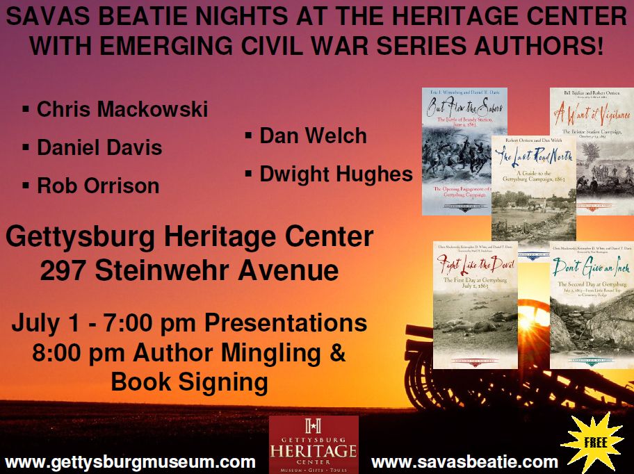 On Saturday evening, you can join Emerging Civil War at the Gettysburg Heritage Center (the old wax museum) for an event that begins at 7:00 p.m. Dan, Dwight, Chris, and Rob will be joined by Dan Welch. They’ll kick things off with a panel discussion at 7:00 followed by a book signing, meet-and-greet, and mingling afterwards. The event is sponsored by our friends at Savas Beatie, LLC.