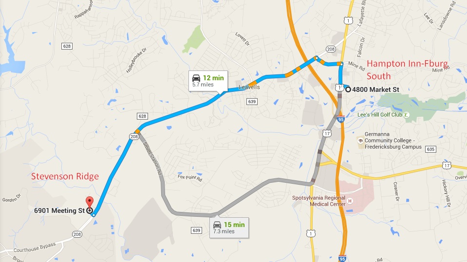 Make a right on US Route 1 (Jeff Davis Highway). Make a left onto Hood Drive. at the intersection with Route 208 (Courthouse Road) make a left. After 4.7 miles on 208, Stevenson Ridge will be on your right.