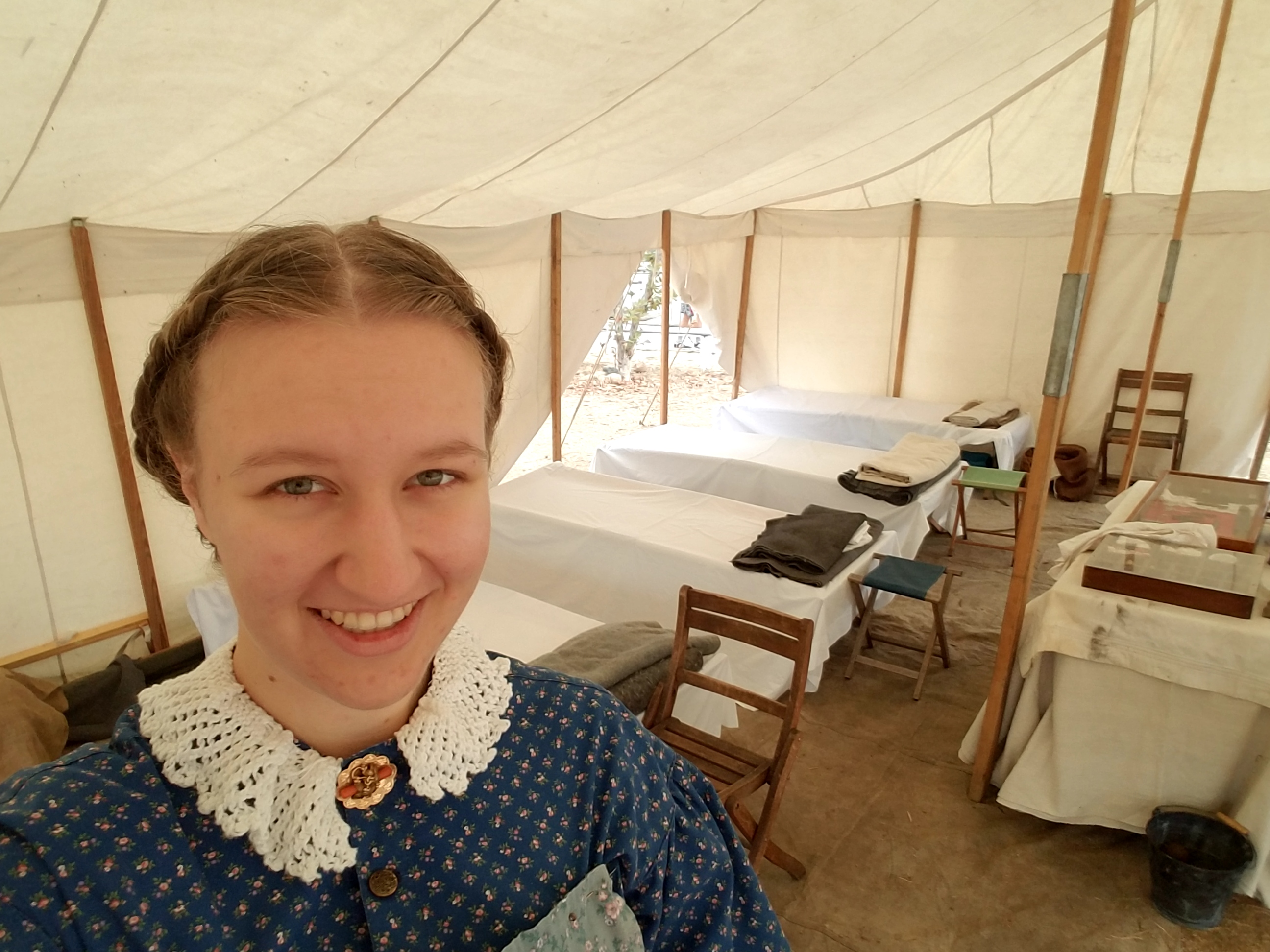 She stood there, staring at the minie ball in her tiny hand and feeling the weight of that original bullet. I was busy talking to the other children and adults at the medical display table and keeping an eye on the “touch and explore” box. I’d handed this little girl – maybe age five or six – the bullet to let her examine the projectile that would’ve been loaded into and shot from the soldier’s rifle she’d seen a few minutes earlier at the School of the Soldier educational station. (And to hopefully distract her from the amputation saw.)