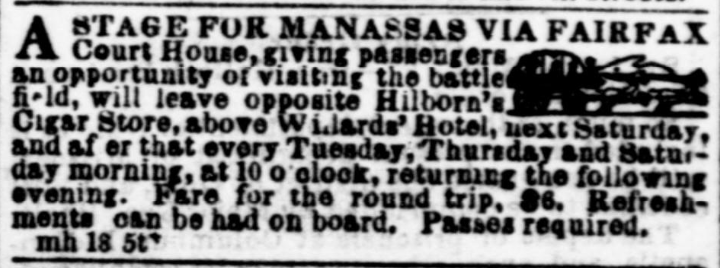 For $6, a passenger could hop on a stage coach and make their way south from Washington and visit the battlefields around Manassas. Even better, as another ad made sure to point out, the proprietor of the stagecoach line had fought at Manassas and could regale his tourists with tales straight from the battlefield: