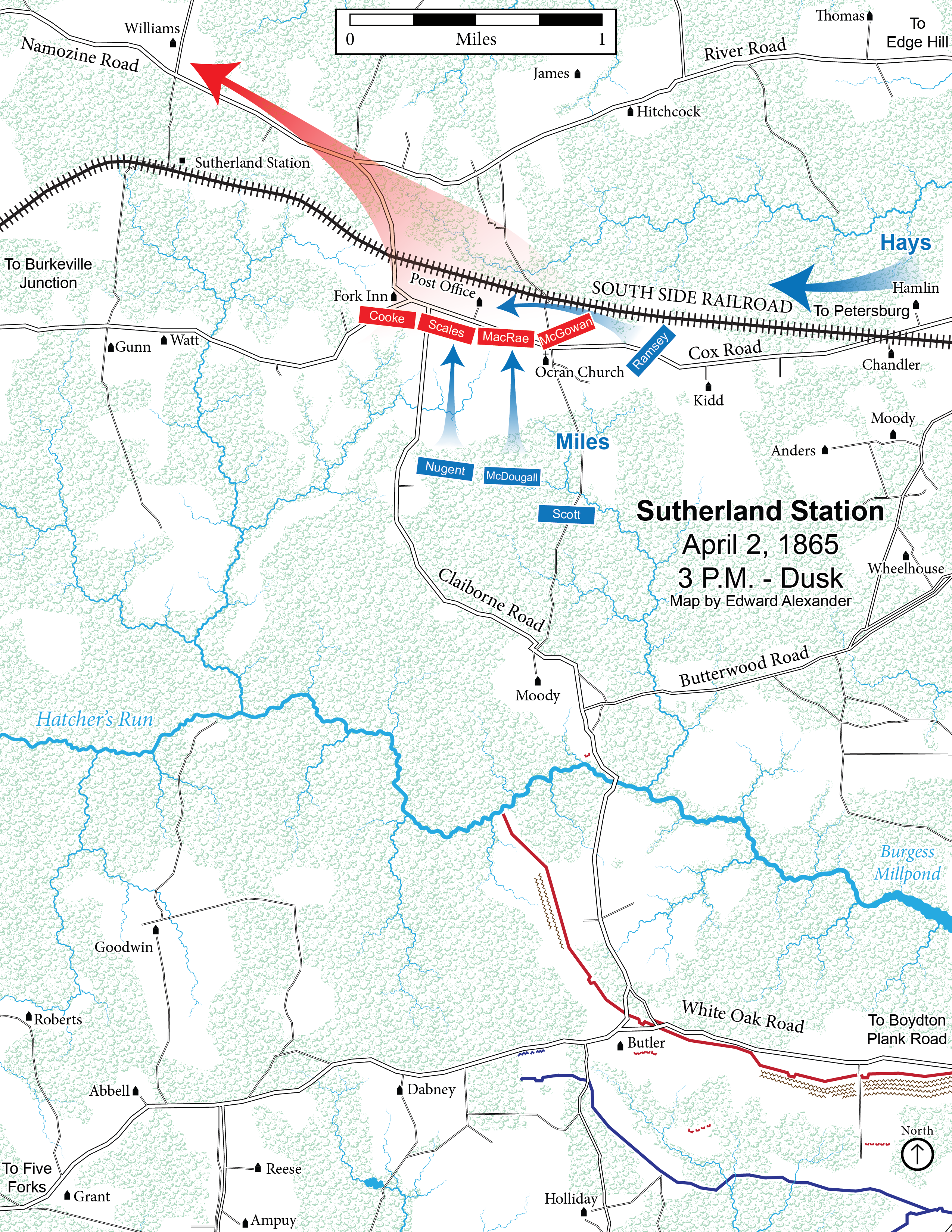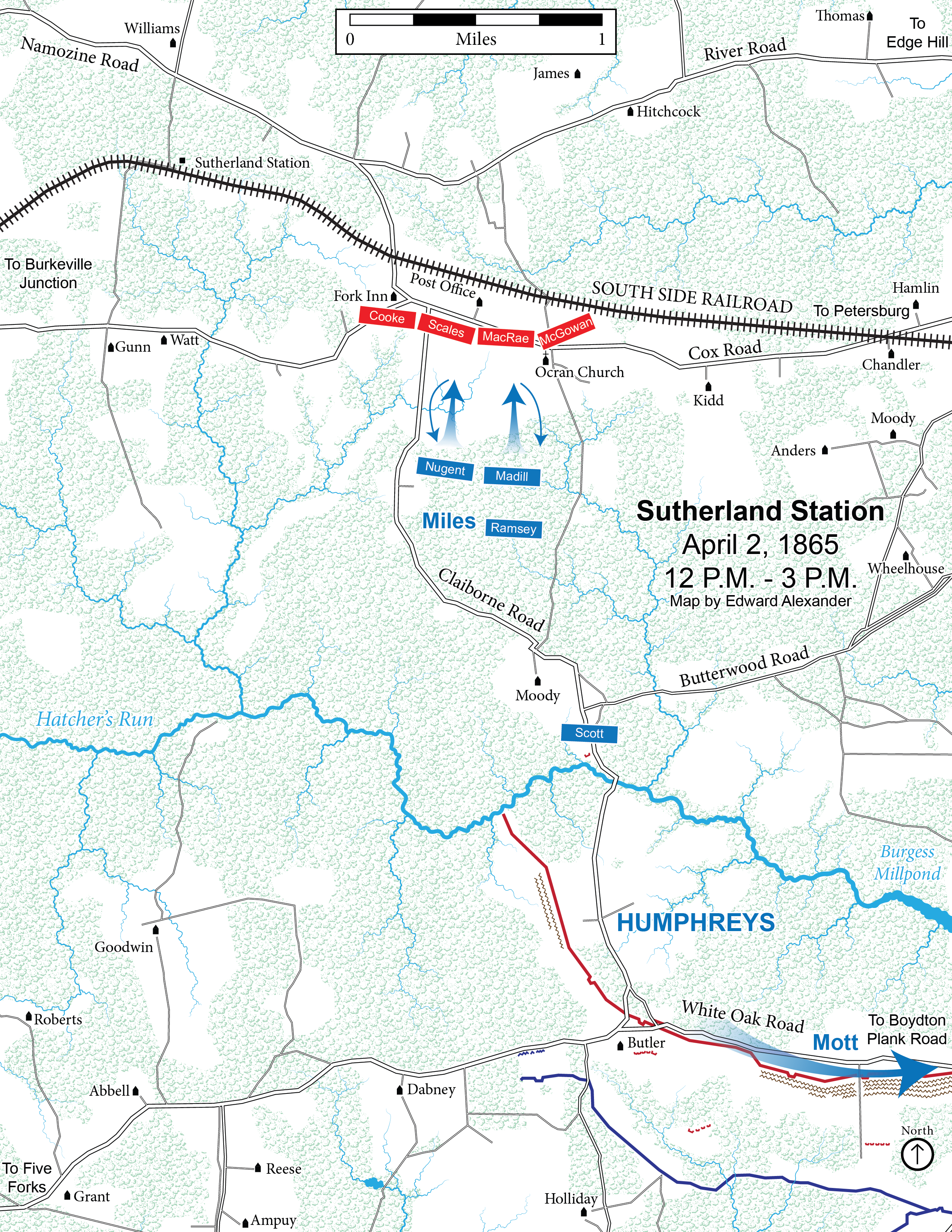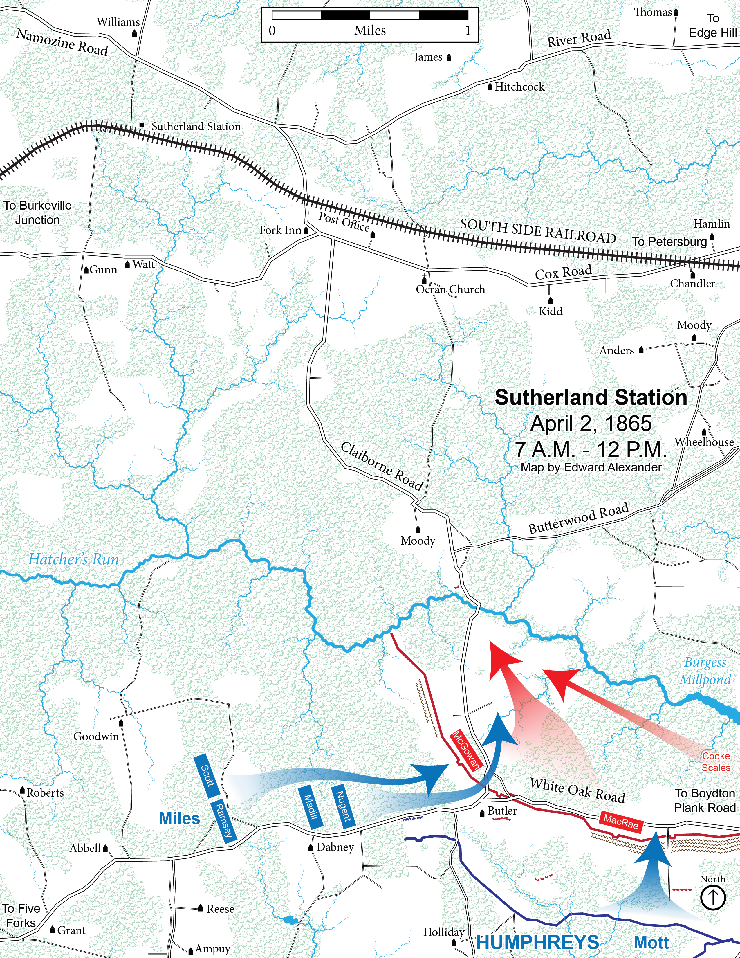 Miles attacked this line on the morning of April 2nd, but the VI Corps breakthrough to the northeast and sweeping of the southern lines down to Hatcher’s Run had already forced the Confederates to evacuate along Claiborne Road until they assumed a defensive posture near Sutherland Station on the South Side Railroad. Miles eagerly pursued the four retreating Confederate brigades but miscommunication between Humphreys and cavalryman Phil Sheridan allowed the southerners time to retreat and position themselves on a dominating plateau just south of the railroad.