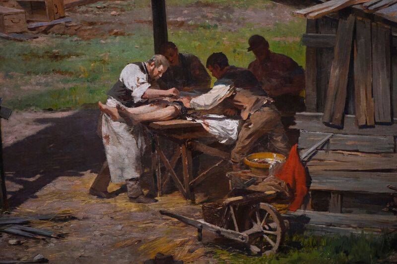 A surgeon amputates the leg of a wounded man at a makeshift field hospital. The injuries to be dealt with in battle were dreadful and the fault of the soft lead Minie Ball. With the capability to kill at over 1,000 yards, this bullet caused large, gaping holes, splintered bones, and destroyed muscles, arteries and tissues beyond any possible repair.