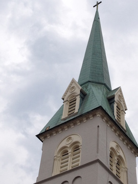On the night preceding the bombardment, the tall spire of the church loomed like a spectre to the soldiers of The Army of the Potomac camped across the river. Regularly from the belfry came the solemn record of the hour resounding among the hills.
