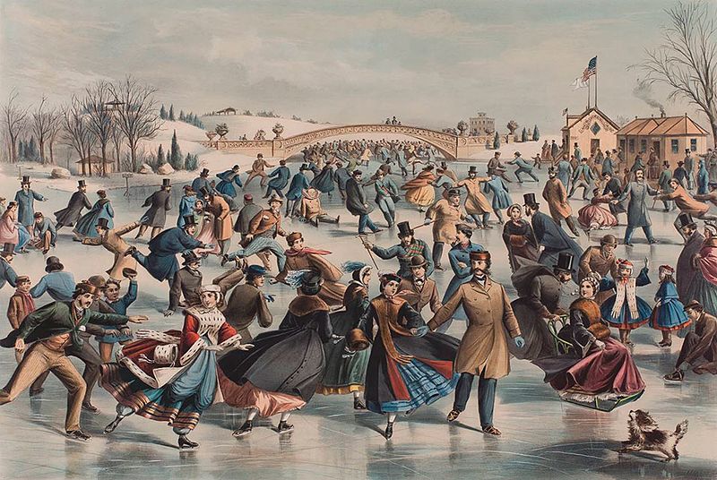 According to an article published in the New York Herald on December 24, 1864, ice-skating on Central Pond gained a happy reputation at the beginning of the decade and had increased popularity each year. A system for judging and announcing ice thickness and safety had been developed, and the citizens eagerly watched for a red ball in the park which signaled skating season had begun. On the city ponds, workmen swept away the snow and scrubbed off the rough piles of ice or frozen snow to make a smooth, glassy surface for easy skating. According to the paper’s account, the ponds were prepared for skaters by noon on fine days when the ice was safe. Skates and ice chairs were available for rent in Central Park, and the enterprising merchants set up booths to sell hot drinks and refreshments.