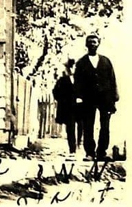 Among the material donated was a print from a ca. 1895 glass plate showing Pinkney Bone standing proudly in front of his store along with his wife and several children. What struck me most about the photo was not Pinkney Bone or the store, but the slightly out-of-focus individual in the bottom right corner. It was likely happenstance that he appeared in the family photo, perhaps just walking down the sidewalk at just the right time. Thankfully, his name was preserved on the photo along with each of the Bone family members. Here’s a better look…