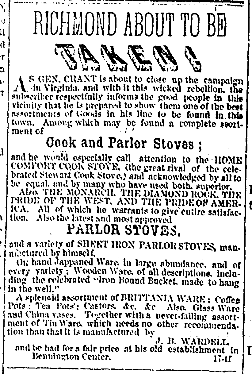 Yes, those ads in Civil War papers make very entertaining reading. It’s interesting that stove salesman J.B. Wardell’s trusty “old establishment in Bennington Center” does not list its prices and relies instead on associating his business with the anticipated success of Grant’s Overland Campaign. As a one-time ad copy writer, I say that’s a risky advertising strategy! Speaking of the fall or Richmond, I wonder if any enterprising Northern business owners ran similar ads prognosticating McClellan’s taking Richmond on his long 1862 Peninsula Campaign, which was launched by sea this month?