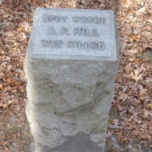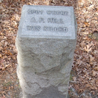 Thanks to the preservation efforts of the Civil War Trust who acquired the property, visitors have the ability to continue on to the actual location according to the SCV who placed an additional small granite marker in 1912. From the Route 1 marker, turn south onto the highway and then immediately turn right onto A.P. Hill Drive into the Sentry Woods subdivision. Turn right onto Sentry Hill Court and then drive to the back end of the neighborhood. Visitors may park on the shoulder next to the Civil War Trust boundary signs and follow the short trail downhill to the “Spot Where A.P. Hill Was Killed.”