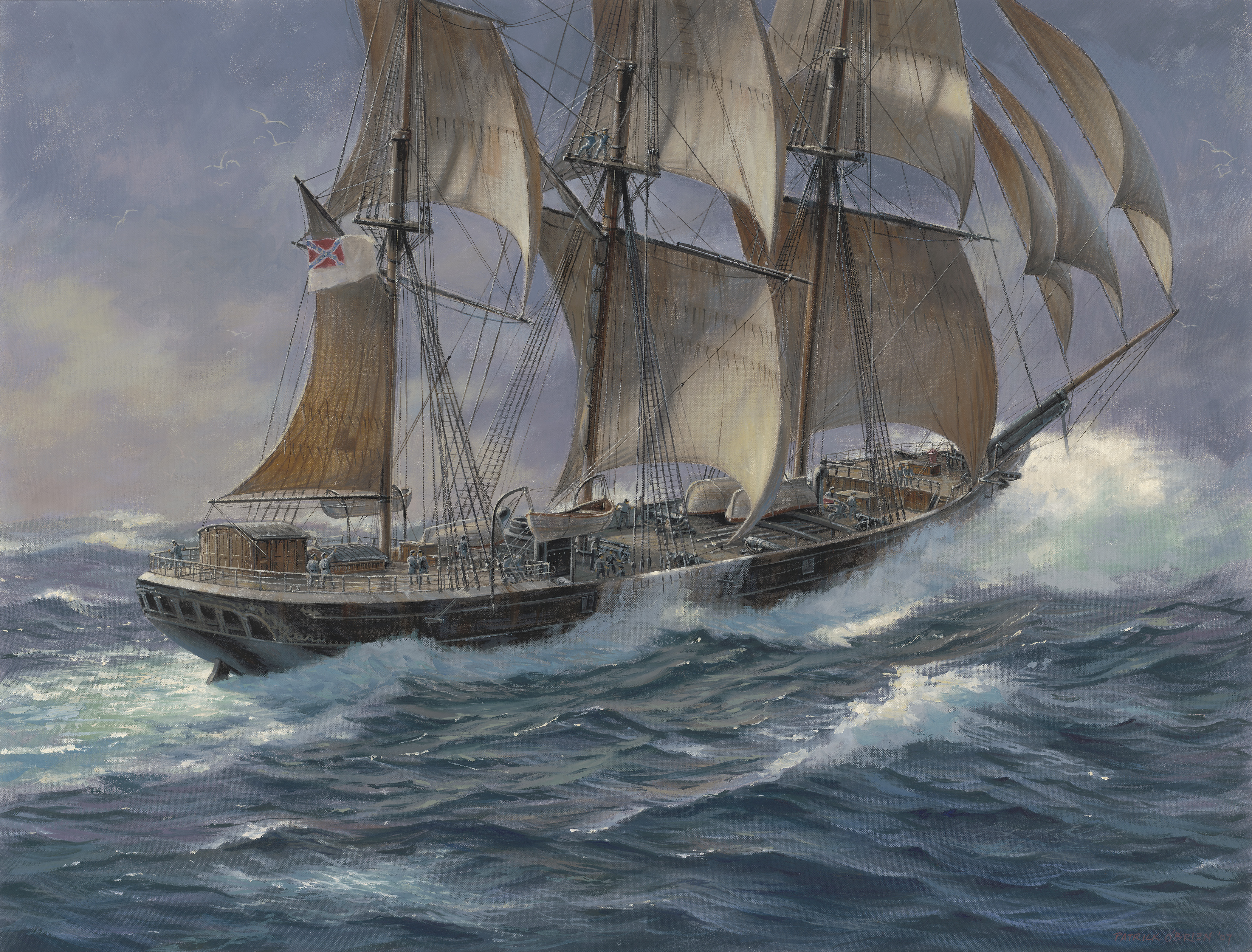 The CSS Shenandoah was enjoying fine weather and fresh breezes, skipping along close hauled on the starboard tack when a cry of “Sail ho!” interrupted the monotony of sea life. The Confederate banner ran aloft; the signal gun barked, and the stranger hove to for inspection.