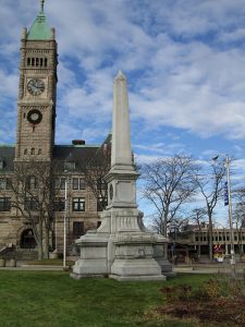 That leaves Private Charles A. Taylor . . . about whom little is known. He joined Company D in Lowell the morning it left for Washington. He had still not been issued a uniform by the time his unit reached Baltimore and there is some mystery as to the actual whereabouts of his remains. Some believe that he was mistaken for a civilian and buried in an unmarked grave as no friends or family ever came forth to claim his body. Even newspaper articles pleading for information turned up nothing. There the story stopped until June 17, 1865. On this date, a large obelisk, the Ladd and Whitney Monument, was dedicated. Ladd’s remains were sent from Alexandria to Lowell to join his friend Whitney’s, and both were reburied in Monument Square in downtown Lowell. In a news article written for the Civil War Sesquicentennial about the deaths of these men, writer David Pevear interviewed Lowell Historical Society Martha Mayo concerning Charles Taylor, whose name was added to the monument around 1908. There is no conclusive trail leading to Taylor’s remains, but Librarian Mayo feels, “I don’t think they would have added the name unless they found something . . . a belt buckle, some bones, something.”[13]Taylor’s plaque on the Ladd and Whitney Monument states that he was among “The First To Fall In Defence (sic) Of The Union.”