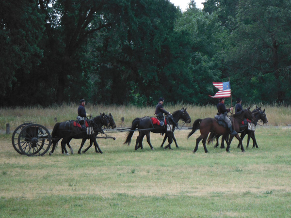 The cannons themselves were bright brass. They were reflective in the early afternoon and threw back flashes of light almost as bright as the sun overhead. Buttons, rings in the harness, the splashing water under the hooves and wheels of the caissons–all bright sparkle. And I couldn’t help but wonder just when was the last time this very field had heard those commands? When had it last cushioned the feet of artillery horses or artillery riders? When had the wind last pushed along the sounds of large guns drawn across an unnamed creek on their way to be fired in battle? Those sounds of the past, those flashes of light, the music of the leather and the wood . . . a Walt Whitman moment, certainly.