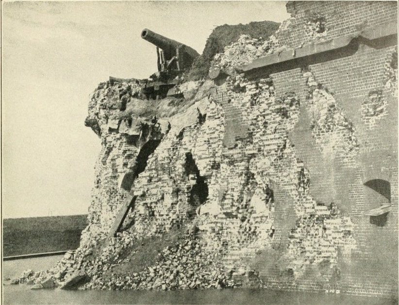 Another three thousand shells and solid shot from 10 and 13-inch mortars and from 8 and 10-inch smoothbore Columbiads “admirably served by the United States troops” did comparatively little damage. “Had these guns only been employed, the probability is that structure would have preserved its integrity and would have held out for an indefinite period.”[2]