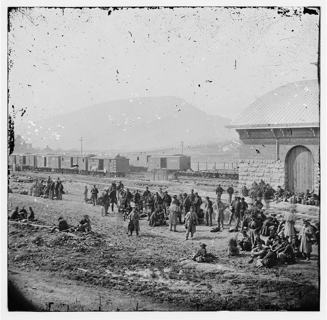 Chattanooga, Tennessee. Confederate prisoners at railroad depot, 1864.