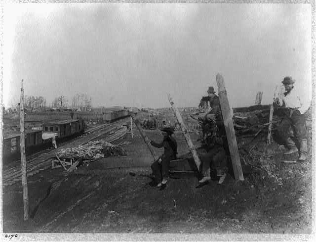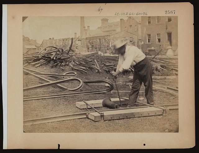 Railroad construction worker straightening track; pile of twisted rails in background. 1862-63