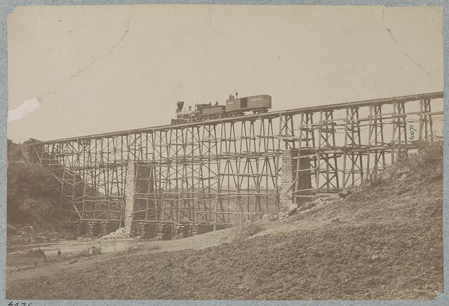 Potomac Creek bridge – Acquia (i.e. Aquia) Creek Railroad built by U. S. Military Rail Road construction corps in nine days from standing timber.