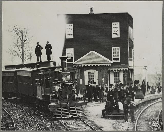 Hanover Junction Pennsylvania, 1863, railroad station. Detail of engine in yard and waiting crowd.