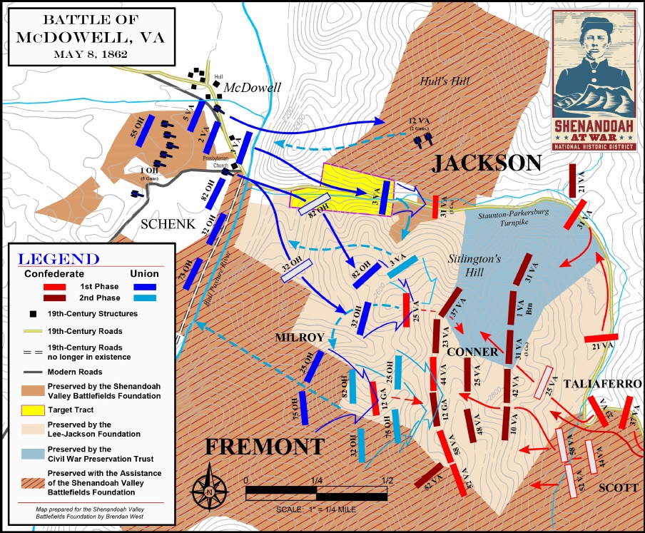 Just last week, our friends at the Shenandoah Valley Battlefields Foundation (SVBF) announced that they had preserved one of the last few acres of the core of the McDowell Battlefield. According to the SVBF, this particular battlefield is unique; with low threats, McDowell’s core area can be fully preserved. Between the American Battlefield Trust, the SVBF, and other preservation groups, over 1,000 acres have been saved at McDowell.