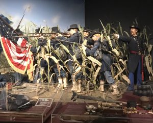 Just behind Old Abe, a diorama catches the eye depicting the Iron Brigade another story central to Wisconsin’s Civil War history. Does anyone recognize where? It is the 6th Wisconsin at Antietam. Wisconsin men were present at one of the deadliest days of the Civil War. One of the men depicted in the exhibit was Major Rufus Dawes who was living in Juneau County, Wisconsin during the war and organized a volunteer company at its start. Dawes remembered:
