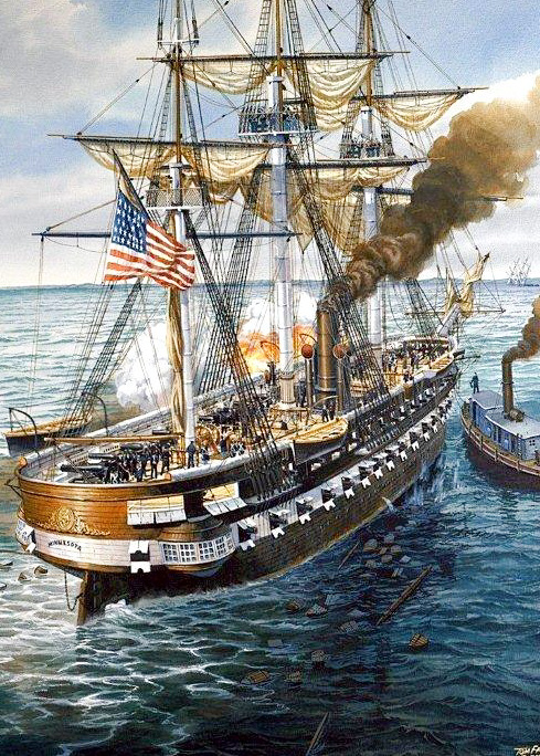 The weak Rebel forts quickly collapsed and were overrun by Butler’s men. Minnesota suffered no casualties at Hatteras, but there would be worse to come. She again was flagship of U.S. Navy forces on March 8-9, 1862, in Hampton Roads when the dreaded Confederate ironclad CSS Virginia sallied forth to wreak havoc on the Federal fleet.