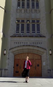 Standing on the steps to Preston Library [VMI] with her research bag in hand, Sarah was looking for facts and real heroes. 2018.