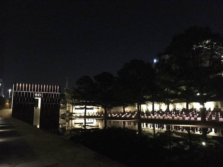By the time I eventually got to Oklahoma City, it was 10:30 at night—but that’s arguably the best time to see the memorial because of its striking lighting and somber atmosphere. It’s simultaneously beautiful and haunting. The noise of the city has quieted, and stillness pervades.