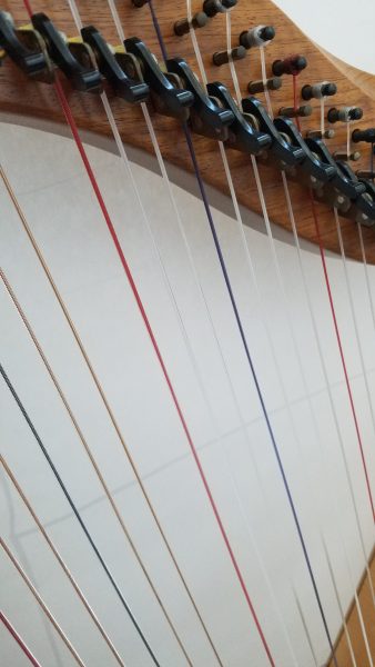 Historically speaking, harps have been around for centuries. Ancient Egyptians played a form of the instrument. King David of Israel composed psalms for harp and lyre and even played to sooth his unhappy predecessor. It’s a popular instrument in South America with a long history in their music. The harp with its “traditional” shape and style has Celtic roots, though later the French enlarged and developed the instrument for orchestra. During the Civil War, many of the Irish regiments used the Celtic harp symbol on their green flags. I received some of my musical training on a pedal harp (the one for orchestra), but I play a Celtic style harp with 36 strings.